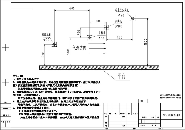 煙氣在線監(jiān)測系統(tǒng)在煙囪上的開孔位置大概在:煙囪直徑的4倍處(變徑之上),根據(jù)煙囪氣流的方向,從左往右開孔依次是:溫壓流孔、氣體采樣孔、環(huán)保參比孔、粉塵(顆粒物)取樣孔、濕度孔5個取樣孔??讖降拇笮。簻貕毫骺?0mm/采樣孔60mm/參比孔80mm/粉塵孔70mm。