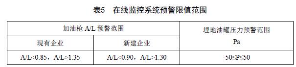 6.3.4 在24 h(自然日)內,在線監(jiān)控系統(tǒng)應監(jiān)測和保存每次加油的A/L,當每條加油槍有效A/L(每次連續(xù)加油量大于15 L)處于表5規(guī)定范圍的次數達到總次數的25%,在線監(jiān)控系統(tǒng)應預警,連續(xù)5 d出現(xiàn)預警狀態(tài)應報警,若當日某加油槍加油次數小于5次時,在線監(jiān)控系統(tǒng)不對該加油槍進行A/L預警和報警判斷,并與次日加油次數進行累計,直至大于等于5次后再進行A/L預警和報警判斷;在線監(jiān)控系統(tǒng)應自動關閉A/L報警的加油槍.