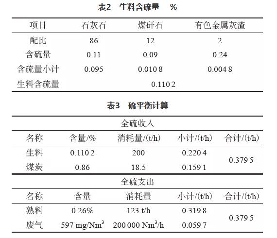 經標定窯尾煙氣量V為200 000 Nm3/h,則大氣排放的SO2濃度a為:a=Q/V=0.119 4×109 mg/h ÷200 000 Nm3/h=597 mg/Nm3。