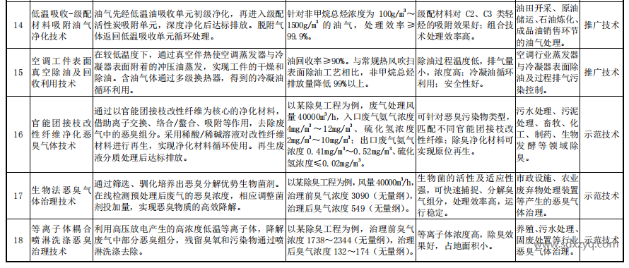 在這些技術(shù)中,有幾項(xiàng)特別引人注目。例如,低溫吸收-級配材料吸附油氣凈化技術(shù)、空調(diào)工件表面真空除油及回收利用技術(shù)被歸類為推廣技術(shù),這意味著這些技術(shù)已經(jīng)具備了廣泛的應(yīng)用基礎(chǔ)和良好的市場前景。而冷凝-吸附-催化油氣回收凈化技術(shù)、官能團(tuán)接枝改性纖維凈化惡臭氣體技術(shù)、生物法惡臭氣體治理技術(shù)和等離子體耦合噴淋洗滌惡臭治理技術(shù)被列為示范技術(shù),顯示了這些技術(shù)在創(chuàng)新性和應(yīng)用潛力上的優(yōu)勢。