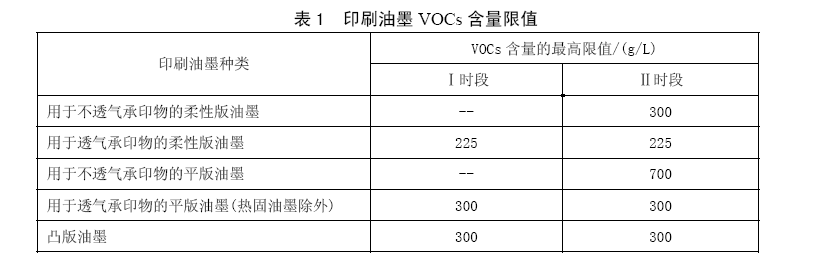 印刷企業(yè)生產(chǎn)過程中使用的印刷油墨VOCs含量限值(為處于即用狀態(tài)以每升油墨所含多少克VOCs計(jì)算)應(yīng)執(zhí)行表1的規(guī)定。