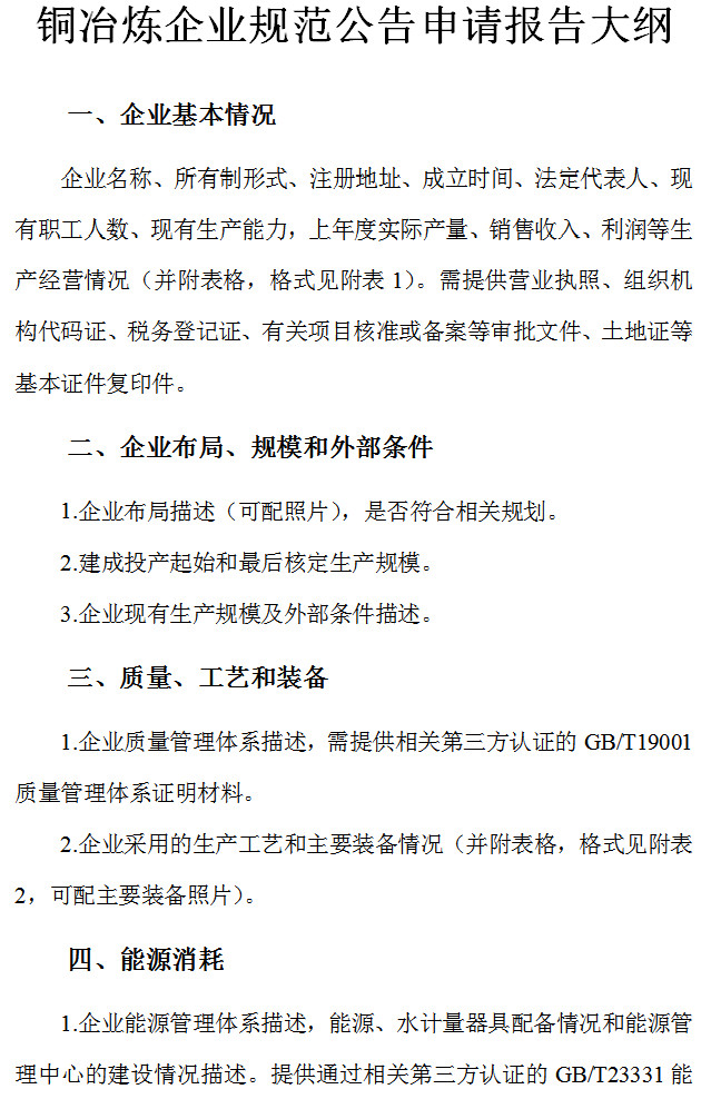(三)本規(guī)范條件自2019年*月*日起實(shí)施,原《銅冶煉行業(yè)規(guī)范條件》(中華人民共和國工業(yè)和信息化部公告2014年第29號)同時(shí)廢止。本規(guī)范條件發(fā)布前已公告的企業(yè),須按照本規(guī)范條件要求重新申請公告。