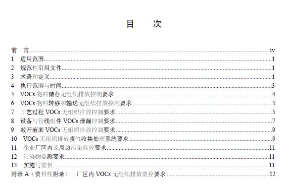 標(biāo)準(zhǔn)規(guī)定了 VOCs物料儲(chǔ)存無組織排放控制要求、VOCs物料轉(zhuǎn)移和輸送無組織排放控制要求、工藝過程 VOCs無組織排放控制要求、設(shè)備與管線組件 VOCs泄漏控制要求、敞開液面 VOCs無組織排放控制要求,以及 VOCs無組織排放廢氣收集處理系統(tǒng)要求、企業(yè)廠區(qū)內(nèi)及周邊污染監(jiān)控要求。