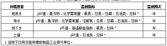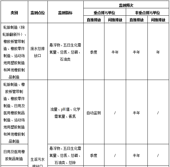 橡膠制品工業(yè)排污單位廢水排放監(jiān)測點(diǎn)位、監(jiān)測指標(biāo)及最低監(jiān)測頻次按照表1執(zhí)行。
