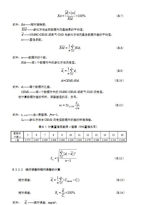 3.10相對準(zhǔn)確度Relativeaccuracy采用參比方法與NMHC-CEMS同步測定廢氣中氣態(tài)污染物濃度,取同時(shí)間區(qū)間且相同狀態(tài)測量結(jié)果組成若干數(shù)據(jù)對,數(shù)據(jù)對之差平均值的絕對值與置信系數(shù)之和與參比方法測定數(shù)據(jù)的平均值之比。