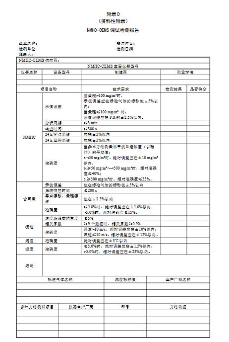 9.3.3驗(yàn)收報(bào)告技術(shù)指標(biāo)驗(yàn)收測試報(bào)告應(yīng)包括以下信息:a)報(bào)告標(biāo)識-編號;b)檢測日期和編制報(bào)告日期;c)NMHC-CEMS標(biāo)識-制造單位、型號和系列編號;d)包括在系統(tǒng)中的NMHC-CEMS的主要組件(如氣體檢測器、流速CMS等);e)安裝NMHC-CEMS的企業(yè)名稱和安裝位置相關(guān)污染源名稱;f)環(huán)境條件記錄情況(大氣壓力、環(huán)境溫度、環(huán)境濕度);g)示值誤差、分析周期、系統(tǒng)響應(yīng)時(shí)間、零點(diǎn)漂移和量程漂移驗(yàn)收引用的標(biāo)準(zhǔn)及技術(shù)指標(biāo)要求;h)準(zhǔn)確度驗(yàn)收引用的標(biāo)準(zhǔn)及技術(shù)指標(biāo)要求;i)可溯源到國家標(biāo)準(zhǔn)的標(biāo)準(zhǔn)氣體;j)參比方法所用的主要設(shè)備、儀器等;k)檢測結(jié)果和結(jié)論;l)測試單位;m)三級審核簽字;n)色譜分析儀出廠檢測原始譜圖復(fù)印件;o)驗(yàn)收測試結(jié)果和驗(yàn)收測試報(bào)告,格式參照HJ75附錄F;7p)備注(技術(shù)驗(yàn)收單位認(rèn)為與評估NMHC-CEMS性能相關(guān)的其他信息)。技術(shù)指標(biāo)驗(yàn)收完成后編制技術(shù)指標(biāo)驗(yàn)收報(bào)告,技術(shù)指標(biāo)驗(yàn)收結(jié)果應(yīng)達(dá)到本標(biāo)準(zhǔn)表1的要求。