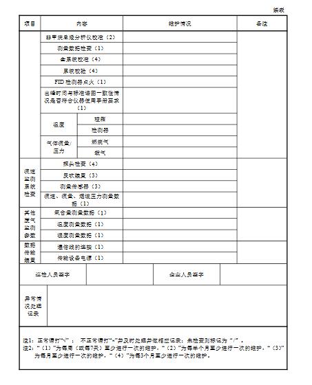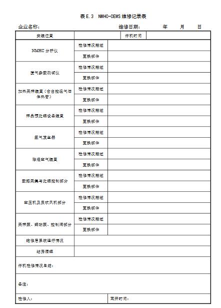 11.3定期維護(hù)維護(hù)頻次按照本標(biāo)準(zhǔn)附表E.1進(jìn)行,定期維護(hù)應(yīng)做到:a)使用氫氣鋼瓶時(shí),至少每周巡檢一次鋼瓶氣的壓力并記錄,有條件的應(yīng)做到一用一備;b)使用氫氣發(fā)生器時(shí),至少每周檢查一次氫氣發(fā)生器變色硅膠的變色 情況,超過2/3變色應(yīng)及時(shí)更換變色硅膠;c)使用氫氣發(fā)生器時(shí),應(yīng)按其說明書規(guī)定,定期檢查氫氣壓力、氫氣發(fā)生器電解液等,根據(jù)使用情況及時(shí)更換,定期添加純凈水;d)至少每周檢查一次除烴裝置溫度是否保持在350°C以上;e)至少每周檢查一次出峰時(shí)間與標(biāo)準(zhǔn)譜圖一致性情況是否符合儀器使用手冊要求;f)至少每月檢查一次燃燒氣連接管路的氣密性,NMHC-CEMS的過濾器、采樣管路的結(jié)灰情況,若發(fā)現(xiàn)數(shù)據(jù)異常應(yīng)及時(shí)維護(hù);g)至少每半年檢查一次零氣發(fā)生器中的活性炭和NO氧化劑,根據(jù)使用情況進(jìn)行更換;h)使用催化氧化裝置的NMHC-CEMS至少每年用丙烷標(biāo)氣檢驗(yàn)一次轉(zhuǎn)化效率,保證丙烷轉(zhuǎn)化效率在95%以上,否則應(yīng)更換催化氧化裝置;i)更換主要部件如色譜柱、定量環(huán)時(shí)需對分析儀進(jìn)行多點(diǎn)校準(zhǔn),并記錄校準(zhǔn)數(shù)據(jù)和過程,校準(zhǔn)數(shù)據(jù)符合本標(biāo)準(zhǔn)表1要求且穩(wěn)定后才可投入運(yùn)行;j)定期維護(hù)記錄按本標(biāo)準(zhǔn)附錄E中表格形式記錄。