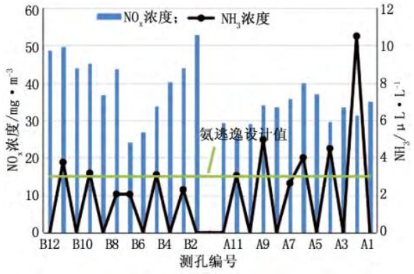 圖1 3號(hào)爐SCR脫硝出口NOx濃度及氨逃逸分布