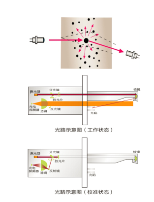 Sdust-100型煙塵濃度監(jiān)測(cè)儀采用激光后向散射測(cè)試原理完成對(duì)被測(cè)煙道的煙塵濃度的測(cè)定。Sdust-100其內(nèi)嵌的高穩(wěn)定激光信號(hào)源穿越煙道,照射煙塵粒子,被照射的煙塵粒子將反射激光信號(hào),反射的信號(hào)強(qiáng)度與煙塵濃度成正變化。Sdust-100檢測(cè)煙塵反射的微弱激光信號(hào),通過(guò)特定的算法即可計(jì)算出煙道煙塵的濃度。