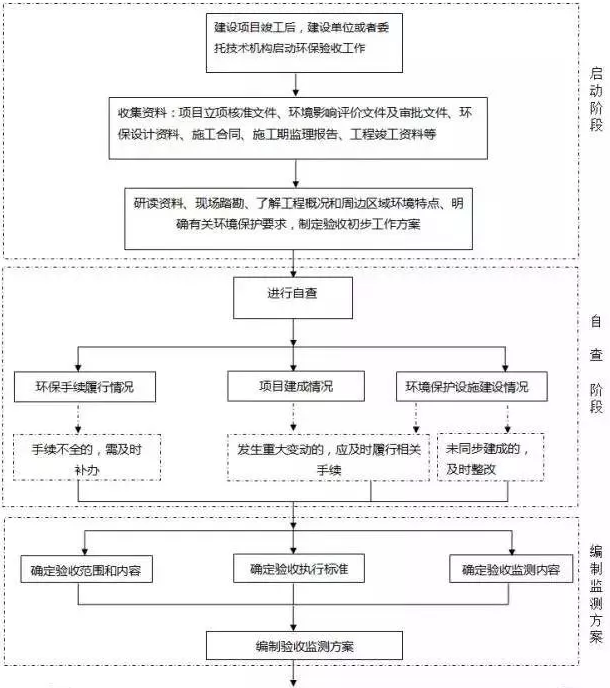 驗(yàn)收監(jiān)測(cè)工作可分為啟動(dòng)、自查、編制監(jiān)測(cè)方案、實(shí)施監(jiān)測(cè)和核查、編制監(jiān)測(cè)報(bào)告五個(gè)階段,具體工作程序見(jiàn)下圖: