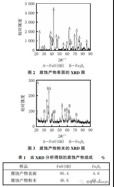 分別對(duì)熱管換熱器爐管外側(cè)的翅片腐蝕產(chǎn)物表面和腐蝕產(chǎn)物粉末進(jìn)行了XRD 檢測(cè),結(jié)果分別見(jiàn)圖2和圖3,由XRD 分析得到的腐蝕產(chǎn)物組成見(jiàn)表1。從表1 可知,腐蝕產(chǎn)物表面主要成分為FeO(OH),而腐蝕產(chǎn)物粉末主要成分為Fe2O3 和FeO(OH)。