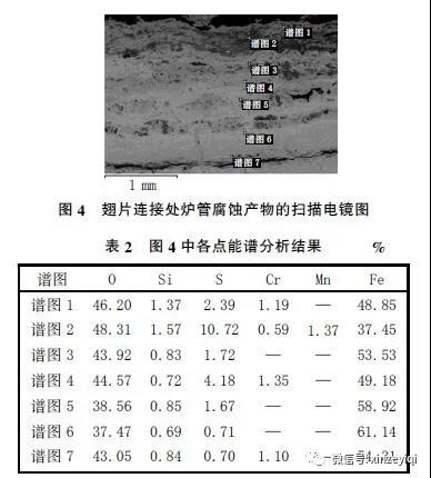對(duì)翅片連接處爐管腐蝕產(chǎn)物進(jìn)行了掃描電鏡及能譜分析,結(jié)果見(jiàn)圖4 和表2。由圖4 和表2 可知,腐蝕產(chǎn)物中O 元素質(zhì)量分?jǐn)?shù)較高,且沿徑向方向由內(nèi)到外大致呈降低趨勢(shì),由48%降至37%;腐蝕產(chǎn)物中存在一定量的S 元素,且存在硫富集帶,其S 元素質(zhì)量分?jǐn)?shù)高達(dá)10%(譜圖2)。以上分析表明,爐管存在嚴(yán)重氧化現(xiàn)象以及不同程度的硫腐蝕。