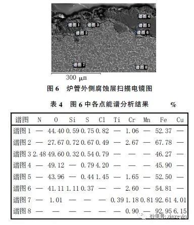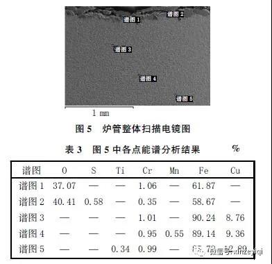 對(duì)腐蝕較輕的爐管進(jìn)行了掃描電鏡及能譜分析,結(jié)果見(jiàn)圖5 和表3。由圖5 可知,爐管表面存在腐蝕層,平均在0.2 mm 左右。由表3 可知,腐蝕層(譜圖1、2) 中存在大量的O 元素,此外還發(fā)現(xiàn)少量的S 元素,而爐管內(nèi)部未發(fā)現(xiàn)O 元素和S 元素,表明爐管外側(cè)發(fā)生了較為嚴(yán)重的氧化腐蝕。