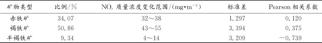 表1混勻礦中鐵礦粉的礦物類(lèi)型與煙氣中NOx質(zhì)量濃度的相關(guān)分析