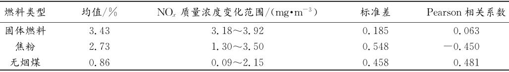因此,在探討固體燃料類(lèi)型對(duì)NOx排放的影響規(guī)律時(shí),將固體燃料比例固定,研究焦粉和無(wú)煙煤的比例變化對(duì)煙氣NOx排放的影響規(guī)律。根據(jù)固體燃料比例樣本數(shù)據(jù)的分布規(guī)律,選取具有代表性的固體燃料比例為3.3%~3.5%的樣本數(shù)據(jù)進(jìn)行相關(guān)性分析研究,結(jié)果見(jiàn)表3。