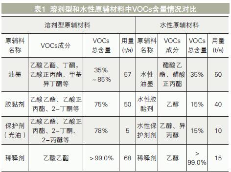 某薄膜印刷企業(yè)分別采用溶劑型和水性原輔材料生產(chǎn)同一產(chǎn)品的情況下,VOCs的成分及含量對比情況見表1。該企業(yè)改用水性材料后,VOCs產(chǎn)生量減少了約80%??梢姴捎盟栽o材料可大大減少VOCs排放種類和數(shù)量。