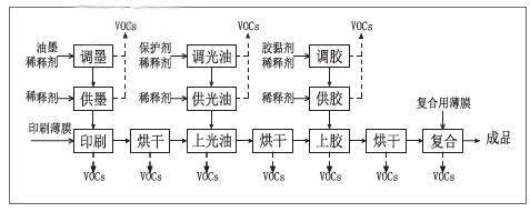 VOCs來源和排放途徑主要有:原輔材料調(diào)配;供料(油墨、光油或膠黏劑);印刷、上膠、上光油、復(fù)合等工藝過程;烘干及設(shè)備清洗等過程中溶劑的揮發(fā),其中揮發(fā)量最大的為烘干,其次為供料過程。在供料過程中,為保證黏度要求,槽中的物料通過槽子底部的孔流入供料桶中,添加稀釋劑后再由泵打入供料槽中,因此處于不斷循環(huán)狀態(tài)。