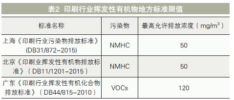 塑料軟包裝印刷企業(yè)產(chǎn)生的廢氣量較大,大部分企業(yè)VOCs濃度在5000ppm以下,屬中低濃度,其中烘干廢氣的溫度通常在50~80℃,VOCs年排放總量大。目前國內(nèi)對于印刷行業(yè)VOCs排放執(zhí)行的標準主要為地方標準,具體見表2。南京地區(qū)主要參照的是上海市《印刷行業(yè)污染物排放標準》(DB31/872-2015)。
