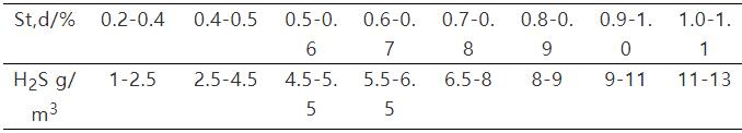 焦?fàn)t爐體竄漏會(huì)導(dǎo)致炭化室荒煤氣進(jìn)入燃燒室,荒煤氣燃燒生成SO2?;拿簹庵蠬2S含量主要取決于裝爐煤的全硫含量,煤中約15-35%硫轉(zhuǎn)入到荒煤氣中,其中95%以上H2S形式存在,荒煤氣中H2S含量與裝爐煤全硫含量關(guān)系見表2[7]。為便于計(jì)算荒煤氣中硫化物以H2S計(jì),含量為5500-13000mg/m3,噸干煤煤氣產(chǎn)率320Nm3,若假設(shè)竄漏率1%,則竄漏荒煤氣中H2S燃燒生成的SO2約為50-120 mg/m3,遠(yuǎn)超過(guò)限制排放標(biāo)準(zhǔn)。