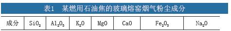 玻璃熔窯排放煙氣的粉塵有以下幾個(gè)特點(diǎn):① 濃度低(1 0 0~8 0 0 m g / N m 3):燃用天然氣時(shí),粉塵主要來(lái)源于原料的高溫分解產(chǎn)物,濃度一般低于200mg/Nm3;燃燒石油焦時(shí),除原料分解外,粉塵還來(lái)源于石油焦中的灰分,但濃度一般也不超過(guò)800mg/Nm3。②粒徑小(<2μm,平均粒徑0.7μm)、表面能大、黏附性強(qiáng)。③成分復(fù)雜,以Na2SO4 鹽為主,燃用石油焦時(shí),還含有V2O5等催化成分,表1為某燃用石油焦的玻璃熔窯煙氣粉塵成分檢測(cè)數(shù)據(jù)。