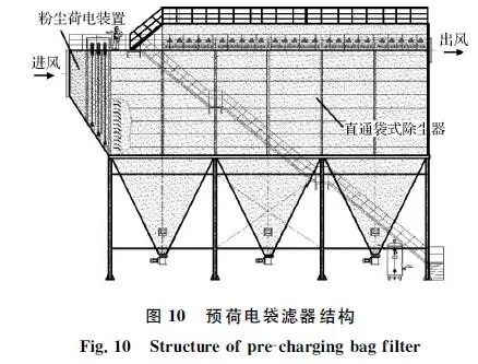 針對(duì)轉(zhuǎn)爐二次煙氣的排放特征,中鋼集團(tuán)天澄環(huán)保科技股份有限公司開發(fā)了預(yù)荷電袋濾器除塵技術(shù),將預(yù)荷電和直通式袋式除塵器復(fù)合形成一體化裝置,如圖10所示。粉塵預(yù)荷電后在濾袋表面將形成海綿狀粉餅結(jié)構(gòu),能提高凈化效率,同時(shí)降低運(yùn)行阻力。中鋼天澄在鞍鋼煉鋼總廠2×180t轉(zhuǎn)爐二次煙氣凈化項(xiàng)目中建成示范工程,處理風(fēng)量2×60萬m3/h。2014年12月正式投運(yùn),截止目前持續(xù)穩(wěn)定,運(yùn)行可靠,顆粒物排放質(zhì)量濃度低于10mg/m3,技術(shù)性能指標(biāo)達(dá)到超低排放,運(yùn)行阻力為700~1 000Pa,低于傳統(tǒng)袋式除塵器。目前,在日照鋼鐵、新余鋼鐵、正大特鋼、唐鋼青龍、柳鋼等得到推廣應(yīng)用。