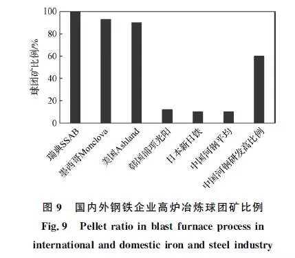 噸球團(tuán)礦的SO2和NOx排放量僅為燒結(jié)礦的約1/2和1/3,提高高爐入爐原料中球團(tuán)礦比例,有利于實(shí)現(xiàn)鋼鐵行業(yè)硫硝源頭減排。目前,國內(nèi)外鋼鐵企業(yè)高爐冶煉球團(tuán)礦比例如圖9所示。歐美國家的高爐球團(tuán)礦比例普遍在90%以上,瑞典SSAB廠為100%全球團(tuán)冶煉,墨西哥Monclova廠為93%,美國Ashland廠為90%。亞洲國家高爐球團(tuán)礦占比普遍較低:韓國浦項(xiàng)光陽廠為12%,日本新日鐵為10%,中國河鋼集團(tuán)平均為10%,主要是因?yàn)榍驁F(tuán)礦的堿度較低(堿度為0.1~0.2)。