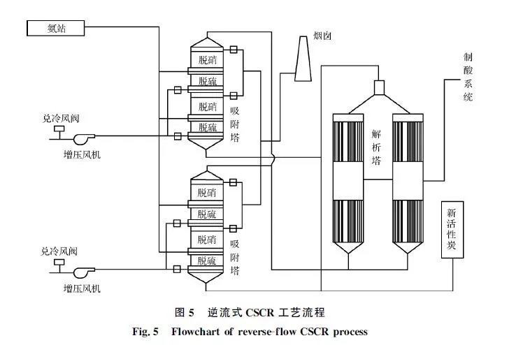 河鋼邯鋼在國內(nèi)率先選用了逆流式活性炭選擇性催化還原(CSCR)凈化燒結(jié)煙氣工藝,工藝流程如圖5所示。SO2通過活性炭的吸附-解析,再經(jīng)過催化氧化制成濃硫酸,實(shí)現(xiàn)了資源回收利用。通過脫硫段后,在上升的煙氣中進(jìn)行噴氨,進(jìn)入脫硝段后在活性炭的催化作用下NOx轉(zhuǎn)化為N2和水進(jìn)行脫硝。2018年2月邯鋼西區(qū)燒結(jié)機(jī)投運(yùn)了逆流式CSCR工藝,實(shí)現(xiàn)長周期穩(wěn)定運(yùn)行和較高的煙氣凈化效率,2018年上半年原始煙氣顆粒物質(zhì)量濃度為50~130mg/m3,SO2質(zhì)量濃度為750~900mg/m3,NOx質(zhì)量濃度為300~400mg/m3,凈化后煙囪NOx排放質(zhì)量濃度低于50mg/m3,SO2排放質(zhì)量濃度低于10mg/m3,固體顆粒物排放質(zhì)量濃度低于15mg/m3。