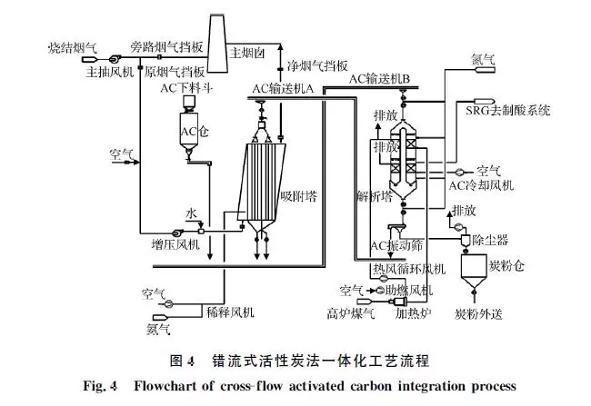 活性炭一體化工藝從煙氣和活性炭運(yùn)動(dòng)方式看可分為兩類:錯(cuò)流式和逆流式。錯(cuò)流式中活性炭和煙氣分別作垂直運(yùn)動(dòng)和水平運(yùn)動(dòng),兩者在運(yùn)動(dòng)方向垂直接觸,在國內(nèi)應(yīng)用相對(duì)較早,典型有太鋼、日照等。逆流式工藝中活性炭自上而下、煙氣自下而上,兩者逆流相向接觸,在國內(nèi)河鋼邯鋼將逆流式工藝首次應(yīng)用于燒結(jié)煙氣處理。