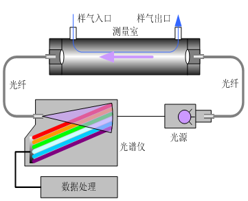 煙氣分析儀是基于紫外吸收光譜分析技術(shù)和紫外差分算法(DOAS)的氣體分析儀器。光源發(fā)出的光束匯聚進(jìn)入光纖,通過(guò)光纖傳輸?shù)酵庵玫母邷販y(cè)量室,穿過(guò)氣體室時(shí)被待測(cè)氣體吸收后,由光纖傳輸?shù)焦庾V儀,在光譜儀內(nèi)部經(jīng)過(guò)光柵分光,由陣列傳感器將分光后的光信號(hào)轉(zhuǎn)換為電信號(hào),獲得氣體的連續(xù)吸收光譜信息。儀器根據(jù)此光譜信息采用差分吸收光譜算法(DOAS),得到被測(cè)氣體的濃度。
