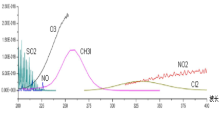 分析儀采用紫外差分算法檢測(cè)氣體濃度,其中SO2、NO、NO2等氣體在紫外波段存在吸收(如圖二),利用此光路(如圖一)即可計(jì)算出吸收光譜,然后利用DOAS技術(shù),可以計(jì)算得到SO2、NO、NO2等氣體的含量,DOAS技術(shù)可以確保計(jì)算結(jié)果受光路污染、氣體中粉塵等雜質(zhì)的影響小。