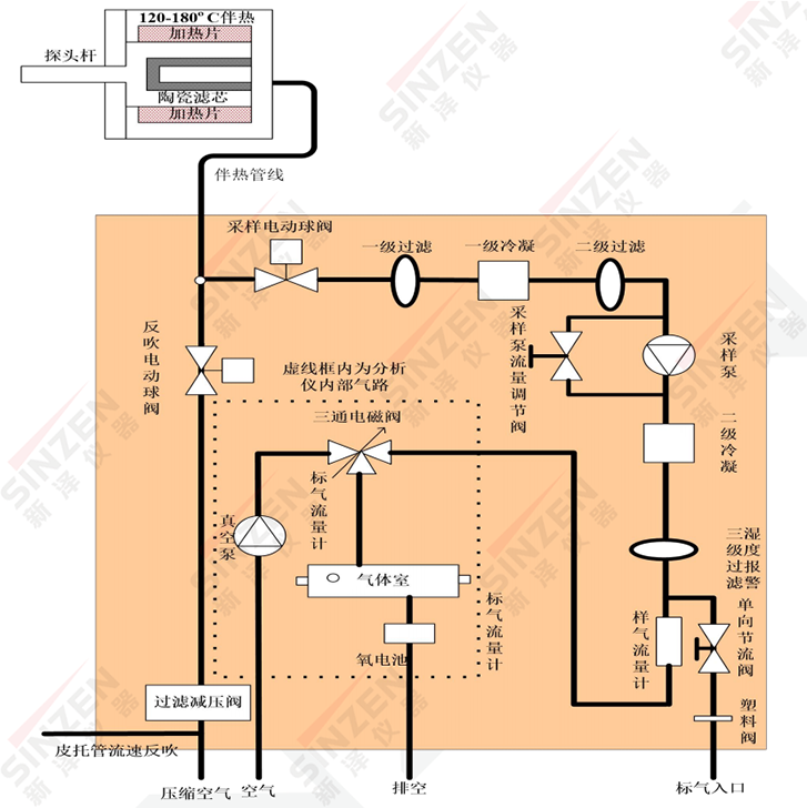 樣氣通過取樣探桿進入到取樣探頭內(nèi),經(jīng)過陶瓷濾芯過濾后,除去樣氣中的粉塵;取樣探頭通過加熱器加熱到120°C~150°C,防止樣氣在經(jīng)過取樣探頭后,產(chǎn)生冷凝水。來自采樣探頭的樣氣經(jīng)高溫伴熱管線,通過二級過濾器除塵,經(jīng)過兩級冷凝系統(tǒng)除水后直接進入分析儀內(nèi)測量氣體室,氣體室放置于分析儀內(nèi),通過紫外光纖連接到紫外差分分析儀,實現(xiàn)對煙氣的測量,最后通過采樣泵將被測煙氣排空;冷凝下來的水經(jīng)排水系統(tǒng)排掉。由控制單元實現(xiàn)自動反吹、自動標定、制冷溫度報警提示等功能,并顯示系統(tǒng)的各種工作狀態(tài)。